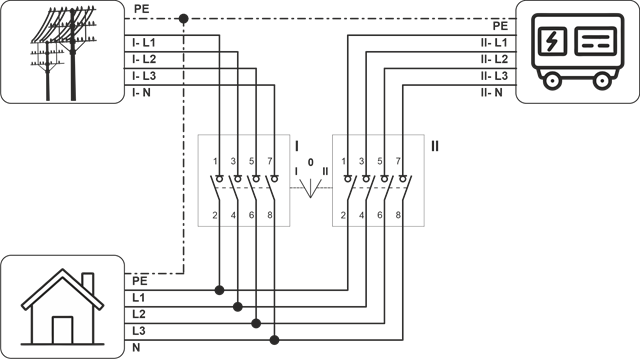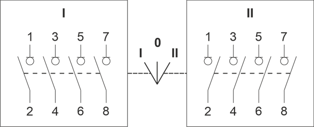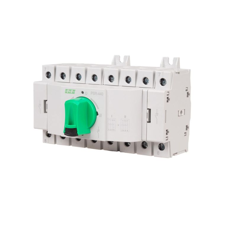 Przełącznik sieć agregat modułowy z przełącznikiem obrotowym PSR-440Modułowe przełączniki instalacyjne sieć-agregat realizują program przełączeń 1-0-2, dzięki czemu możliwe jest np. podłączenie do wyjścia jednej z dwóch linii wejściowych, lub całkowite rozłączenie obwodów. Styki przełącznika pełnią funkcję rozłącznika, możliwe jest więc dokonywanie przełączeń do znamionowego prądu obciążenia.