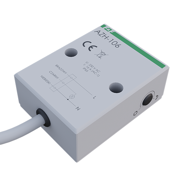 Włącznik zmierzchowy AZH‑106-24V posiada układ opóźniający załączenie i wyłączenie oświetlenia, który niweluje wpływ zakłóceń (np. wyładowań atmosferycznych) na pracę automatu.