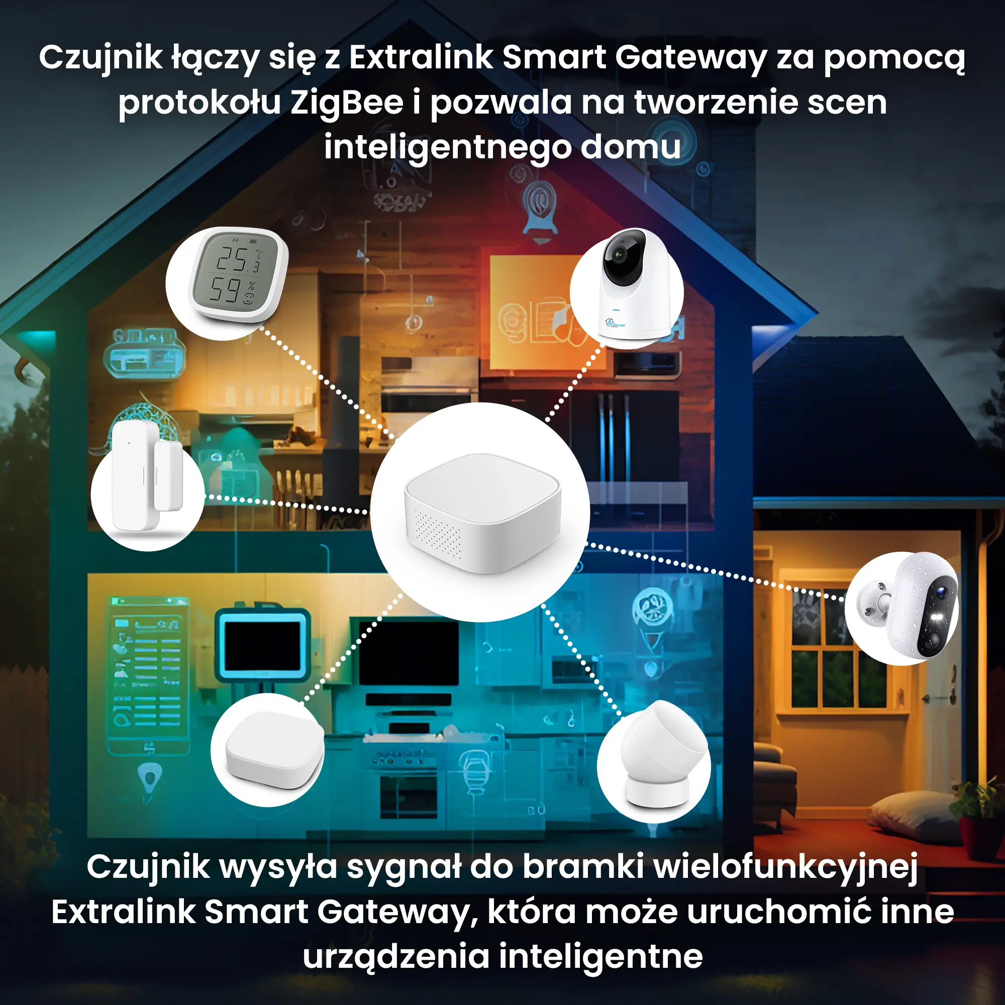 Czujnik Extralink wykrywa wartości temperatury i wilgotności otoczenia oraz wyświetla wartości temperatury i wilgotności na czytelnym ekranie LCD. Czujnik wysyła sygnał do bramki wielofunkcyjnej Extralink Smart Gateway, która może uruchomić inne urządzenia inteligentne.