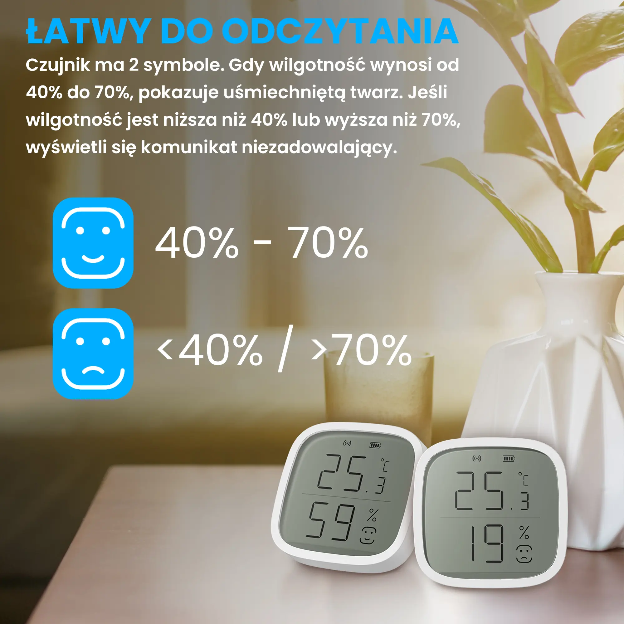Poziom komfortu otoczenia jest wyraźnie widoczny na ekranie urządzenia poprzez wyświetlanie uśmiechniętej twarzy dla dobrych warunków oraz smutnej twarzy dla gorszych warunków otoczenia.