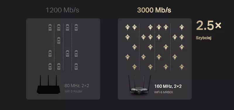 MR80X oferuje bardzo szybkie połączenia bezprzewodowe. Są to połączenia z prędkością do 3 Gb/s. Wykorzystaj płynne pobieranie i wysyłanie dużych plików, pozbawione zacięć odtwarzanie VR oraz doskonałą transmisję strumieniową 4K bez opóźnień. Dzięki MU-MIMO i OFDMA, MR80X przesyła dane do i z wielu urządzeń w tym samym czasie, zapewniając 4-krotnie większą przepustowość, znacznie zmniejszając opóźnienia i zwiększając wydajność transmisji w tych samych warunkach