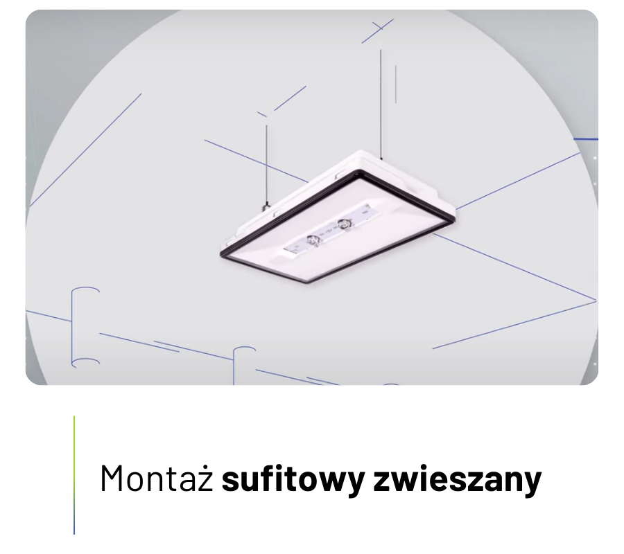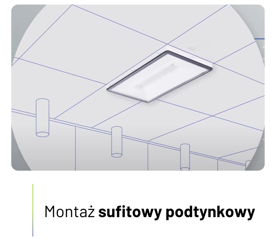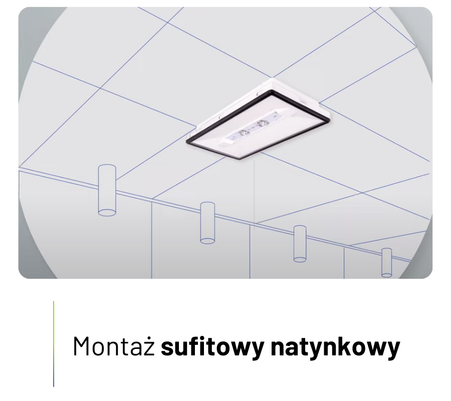 Montaż sufitowy - natynkowy, podtynkowy, zwieszany. Montaż ścienny - natynkowy, flagowy, kątowy