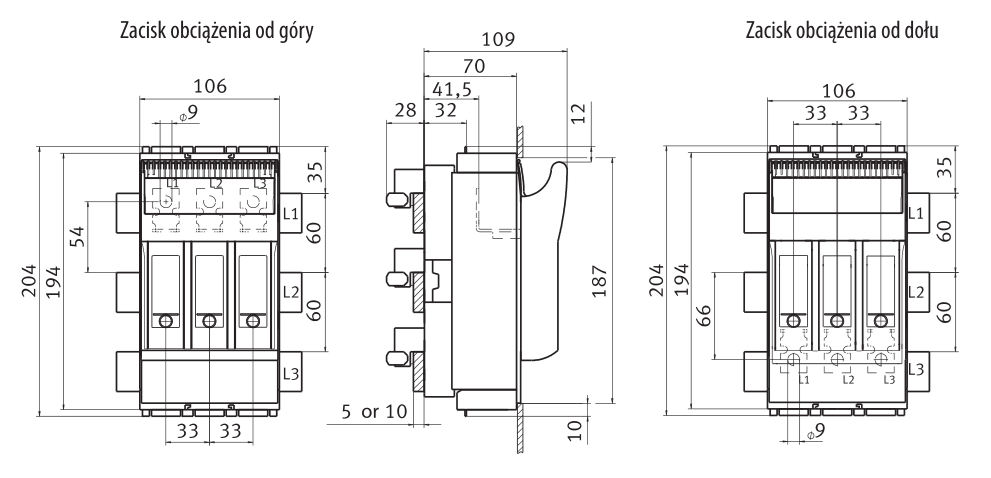 - Jednakowe wymiary okna w maskownicy dla wszystkich wielkości rozłączników. Różne głębokości zabudowy (32mm, 60mm, 70mm, 90mm) i montażu maskownic.