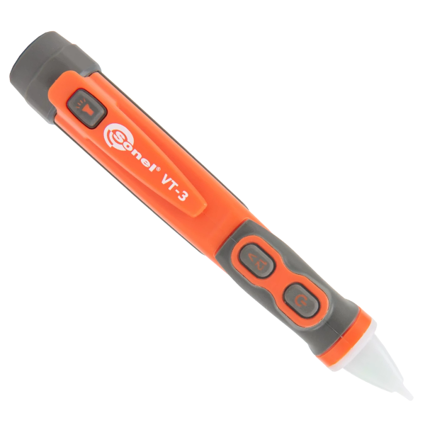 Kieszonkowy, bezdotykowy wskaźnik napięcia Sonel VT-3 jest nowszą wersją popularnej „neonówki”. Przyrząd charakteryzuje się bogatą funkcjonalnością, a także lekkością i łatwością w użyciu. Urządzenie jest przeznaczone do wykrywania napięcia przemiennego w przewodach oraz w osprzęcie elektrycznym. Wskaźnik posiada podstawowy zakres detekcji 100...1000 V, ale dolny próg można obniżyć do 12 V poprzez naciśnięcie specjalnego przycisku. Kolorowe diody LED umieszczone na końcówce przyrządu informują o trybie pracy oraz o poziomie wykrywanego napięcia.
